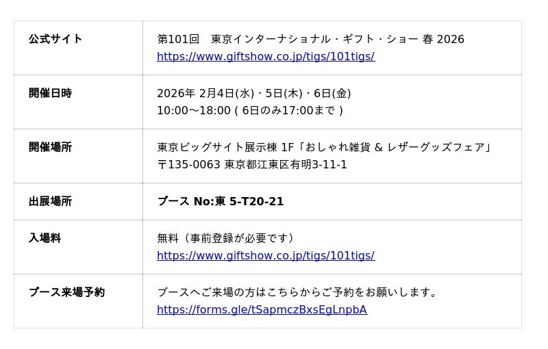 株式会社ウォーターフロント(本社:東京都渋谷区、代表取締役:吉野 哲)が展開する傘ブランドWaterfrontは2026年2月4日(水)から6日(金)までの3日間、東京ビッグサイトで開催される「第101回 東京インターナショナル・ギフト・ショー 春 2026」へ出展します。累計販売本数2,400万本を超えた超薄型傘「ポケフラット」シリーズや、圧倒的なたたみやすさを実現した「クイックシャット」シリーズ、強力な雨・風・日差しまでしのげる全天候型の傘「ZENTENKOU」などWaterfrontを代表するラインナップが並びます。各シリーズの新商品も実際に手に取ってご覧いただけます。皆様のご来場を心よりお待ちしております。