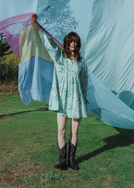 陽気なワールドミュージックを思わせるプレイフルなストライプ柄のギャザードレスやセットアップは、リズミカルな配色が夏の装いに高揚感をもたらします。70年代のヒッピーから着想を得たジオメトリック柄のオールインワンは、辛口なデザインやカラーリングでモダンに引き締めて。