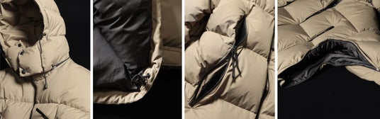 最高峰のダウンを守る表地は帝人の「MINO TECH(ミノテック)」を使用。傘にも使用されている撥水生地を通常サイズの縫製に使う約3倍の生地量で、天候の変化から守ります。