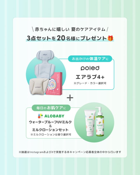 コマースメディア株式会社(本社:東京都豊島区、Poled日本総代理店)は、ベビー向けオーガニックスキンケアブランド「ALOBABY(アロベビー)」とのコラボレーションによる「Poled × ALOBABY 赤ちゃん想いの夏ケアコラボキャンペーン」を、2025年7月11日(金)より開催いたします。本キャンペーンでは、Poledの赤ちゃん用クールシート「エアラブ4プラス」と、ALOBABYのスキンケア商品「ウォータープルーフUVミルク」と「ミルクローション」を3点セットにしてInstagramおよびX(旧Twitter)の応募者全体から合計20名様にプレゼントいたします。