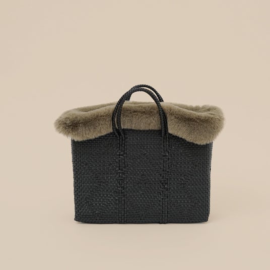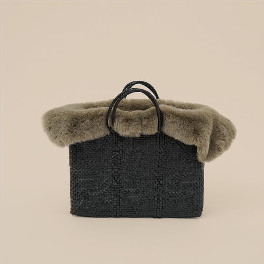 今シーズン、気になるトレンドのエコファー素材。冬のウールやダウン素材に対し、あえてかごバッグ特有の軽快な素材感と、ふわふわのエコファーを合わせることで、「異素材MIX」の絶妙なバランスを生み出します。