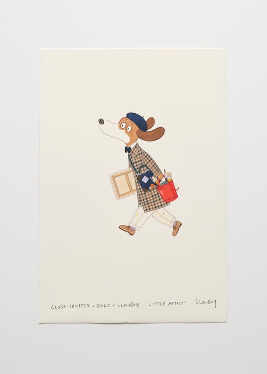 トリプルコラボレーションしたスーツケースにプリントされている、Mr. Slowboyが自身を描いたイラスト『The Artist』と、その仲間であり、「ダックス」の愛すべきマスコットであるダックスフンドの「マックス」を描いたイラスト『The Little Artist』の貴重な原画作品を出品いたします。(各1点、計2点)