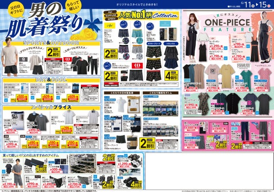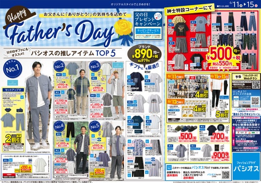 父の日ギフトにもオススメの、パシオスの推しアイテムを使ったコーデや、ブランドアイテムなどをご紹介。チラシ裏面では、父の日ギフトにもらって嬉しい【男の肌着祭り】を開催いたします。