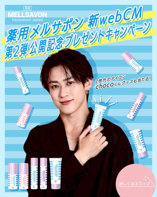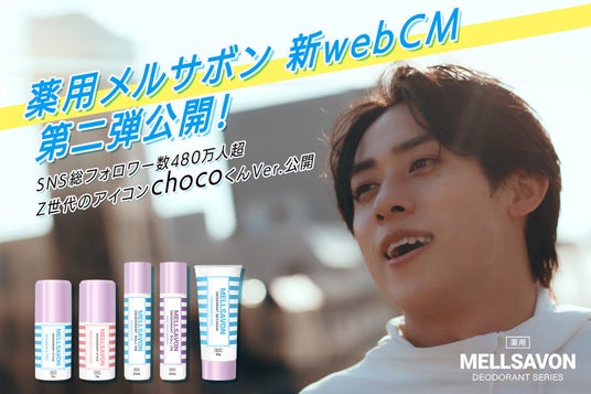 株式会社ジャパンゲートウェイ(所在地:東京都中央区 代表:伊藤英信)が展開する、ボディケアブランドMELLSAVON(メルサボン)から、今春新発売した薬用デオドラント商品のWebCMが6月1日から中川翔子さん出演で公開されており、第2弾WebCMが2025年6月16日から公開します。第2弾CMには、Z世代のアイコン的存在で、SNS総フォロワー数480万人を超える人気タレントの「choco」くんが出演。頑張る汗の美しさと青春感を、chocoくんの活動にフォーカスして表現した内容となっています。また、CM公開を記念してメルサボン公式Instagramでプレゼントキャンペーンを行います。