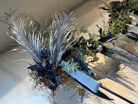 流木とAOKI DENIM の生地を使用し、店内装飾を行う能勢 聖紅氏