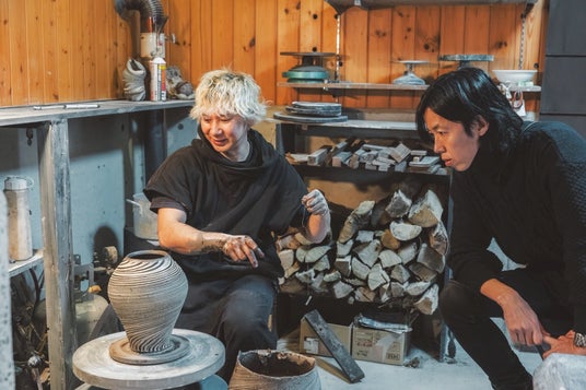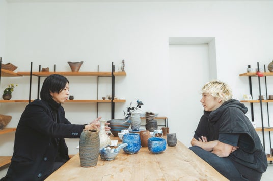 コラボレーションの打ち合わせを重ねる AOKI DENIM デザイナー青木俊樹 (写真左) と備前焼作家 石田和也 氏 (写真右)