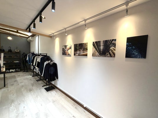 AOKI DENIM -PREMIUM INDIGO LAB- エントランス空間。シーズン別の制作現場やインスピレーションを映すパネル演出を行う