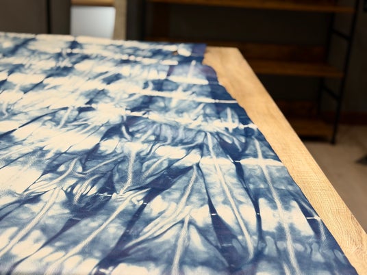 デニム製品に使用される本藍染を施した牛革。一枚一枚絞りの表情が違うのも魅力。店内でも公開されている。