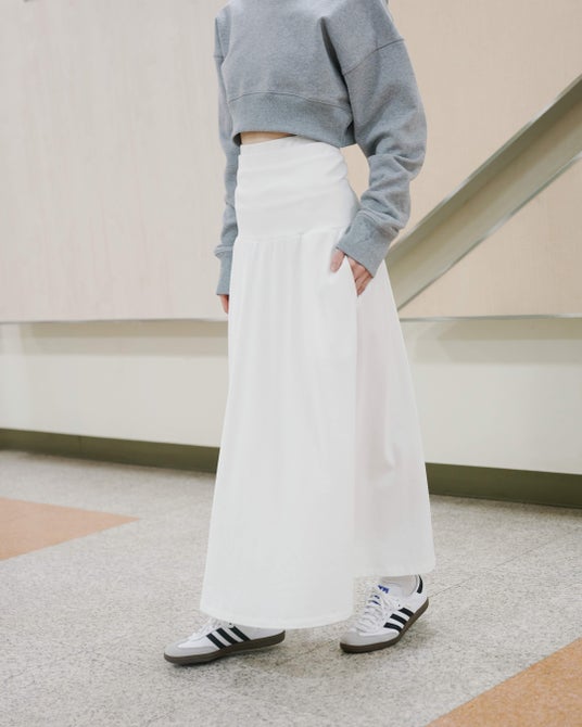 スカートは動きのあるフレアシルエットで、コーディネートにも取り入れやすいデザインに仕上げました。移動中だけでなく、旅先での街歩きにもそのまま着用できるアイテムです。