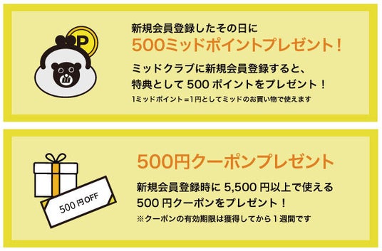 まだミッドの会員でない方も新規会員登録をしていただくと、【500ポイント】+【5,500円以上で使える500円クーポン】をプレゼントしています。
