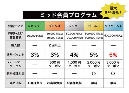 この機会にぜひミッドの会員登録をして、お得な特典と新しい会員ランク制度をお楽しみください。
