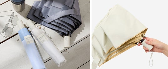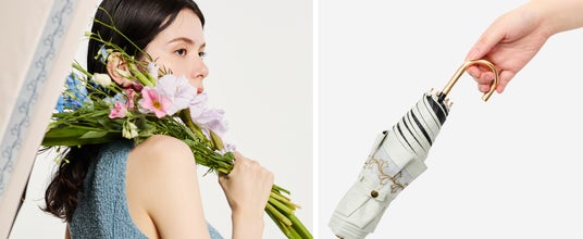 長傘に多い曲がり手元を折りたたみ傘に落とし込んだ「スレンダーハンドル」。さしている時に持ちやすいだけでなく、閉じている時にカバンや手にかけられるため持ち運びもしやすいのが魅力です。ハンドルはゴールドで高級感もアップ。アクセサリーのようにファッションに取り入れるのもおすすめです。こちらもUVカット率/遮光率100%、高い遮熱性能も持った日傘(晴雨兼用傘)。