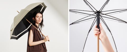 中でも生地裏面にカラーコーティングを施した「デュオトーン」が注目。表面にはベーシックな色を、裏面には遊びのある色を持ってくることにより、使いやすさがありながらも差し色を楽しめる今までになかったデザインです。日傘の裏面はブラックコーティングがほとんど。暗くなりがちな傘の中、さして歩いている時も顔まわりを明るく見せてくれます。屋外で写真を撮ることが多い、旅行などにもおすすめ。