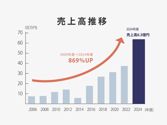 日本発の等身大でラグジュアリーなバッグや財布を展開するSALON DE ALFURD (サロンドアルファード)(満田工業株式会社 本社:埼玉県吉川市 代表取締役:満田浩樹)は、2024年度決算で、売上高6.3億円となりました。2009年に満田浩樹が社長就任してから869%以上の成長(2014年度が減少しているのは決算期変更のため)です。その間、ファッション需要が激減したコロナ禍にはオンライン販売を促進し、その前の2019年と比較して2倍以上の増収を達成しています。