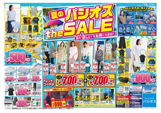 【夏のパシオス the SALE】では、均一価格セールや、高気温に備えて準備したい接触冷感、UV・熱中症・日焼け対策ができるアイテムなど、夏の“欲しい”をお得に大放出いたします。