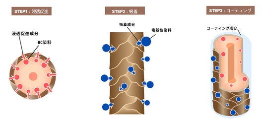 染料にはWカラー設計(「HC染料」と「塩基性染料」)を取り入れ、「浸透促進」→「吸着」→「コーティング」の3ステップ設計で、色持ちと質感のバランスを整えています。