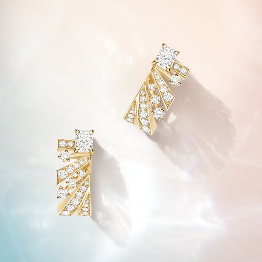 温かい朝日にインスパイアされたこの作品は、様々なボリュームと角度の光線が広がり、中央の0.5カラットの放射状カットダイヤモンドから光が溢れ出しています。ホワイトゴールドとイエローゴールドの組み合わせ、グラフィカルなライン、パヴェ、そしてチェーンのダイヤモンドが光とコントラストの遊びを強化しています。