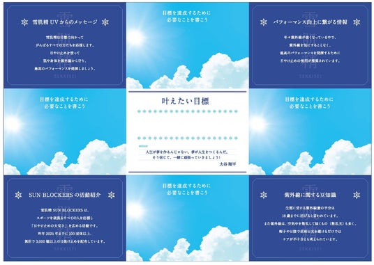 本チャートは、世界を舞台に圧倒的なパフォーマンスを発揮し続ける大谷選手が高校時代に目標達成のために活用していた「マンダラチャート」から着想を得て制作しました。日やけ止めを使ってもらうことで肌や身体を紫外線から守るとともに、目標へのプロセスを可視化するチャートを活用いただくことで、心身の両面からスポーツを頑張るすべての人を強力にサポートします。
