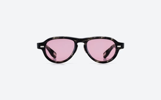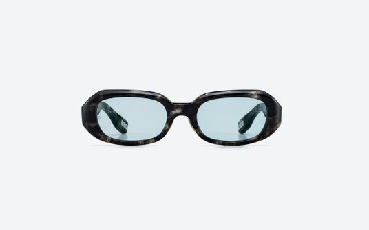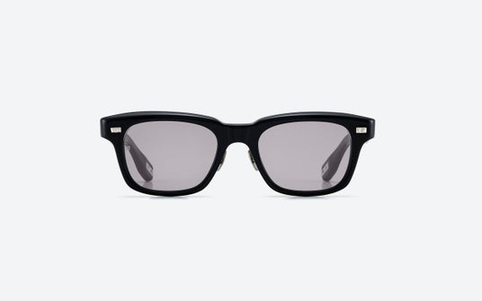 アセテートフレームは 厚さ10mm のアセテートを立体的に削り出したフロントに、SILVER 925 のスタッズや建築的モチーフを組み合わせた構造美のデザイン。宝石を磨き上げるように削り出されたフォルムが、素材の純度と存在感を際立たせます。