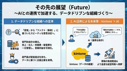 同社は、部門長クラスが売上だけでなく販管費を引いた営業利益まで把握し、ファクトに基づくスピーディな意思決定を行える体制を目指しています。さらに、kintoneを「データの基盤」、AIをUI(インターフェース)として活用する検討等、現場負担を減らしつつ経営判断の高度化を図る構想も示されています。