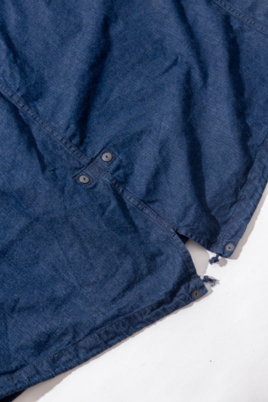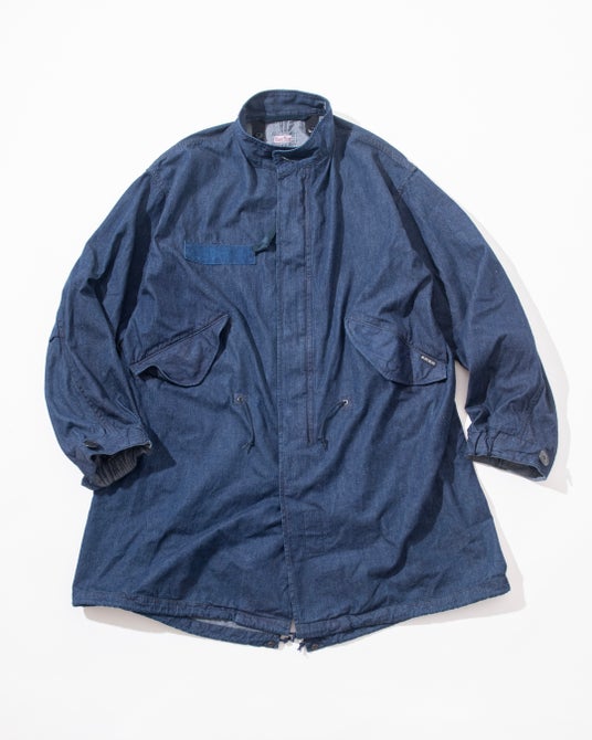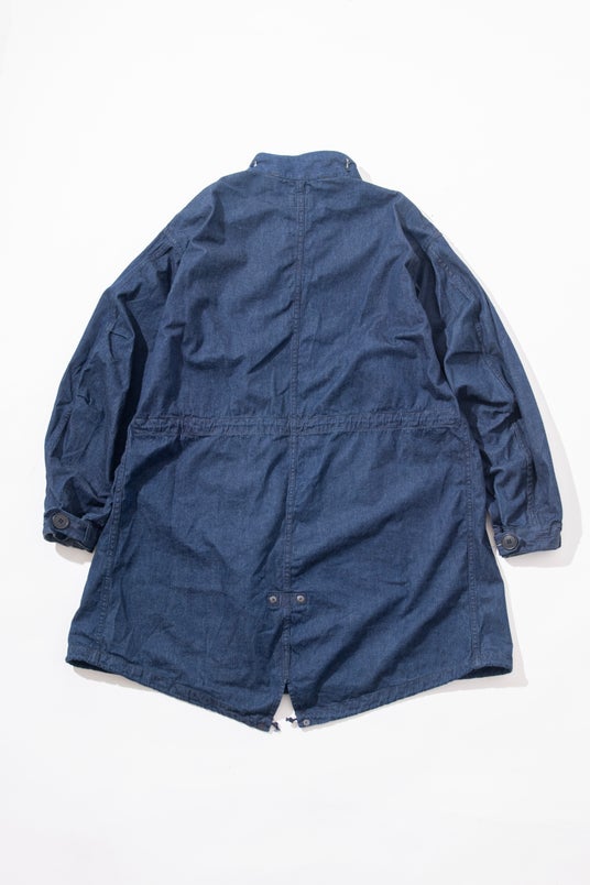 オリジナルデニムで仕立てた、本格志向のフィッシュテールコートです。7ozのBLUE BLUEオリジナルデニムは、タテヨコ20番手の糸を高密度に打ち込み、厚みを抑えつつもハリとコシを兼ね備えたタフなライトデニムに仕上げています。1960年代米軍のフィッシュテールコートをベースに、アームホールやポケット位置を調整し、ボリューム感を残しながら全体をすっきりと整えることで、現代的なバランスを実現しました。