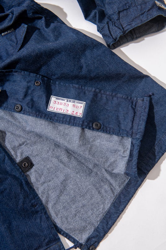 左胸には〈BLUE BLUE〉の刺繍ロゴをあしらい、無骨なデザインにさりげないアクセントをプラスしています。