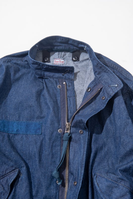 インディゴ染めの胸元コットンテープなど細部にもこだわりを込め、素材をデニムに置き換えることで、ミリタリー由来の一着に落ち着きのある雰囲気を加えています。秋口には軽快なアウターとして、冬には別売りの〈gym master × BLUE BLUE〉フリースライナージャケットを装着することで、防寒性を高めた重厚なアウターとしても活躍します。
