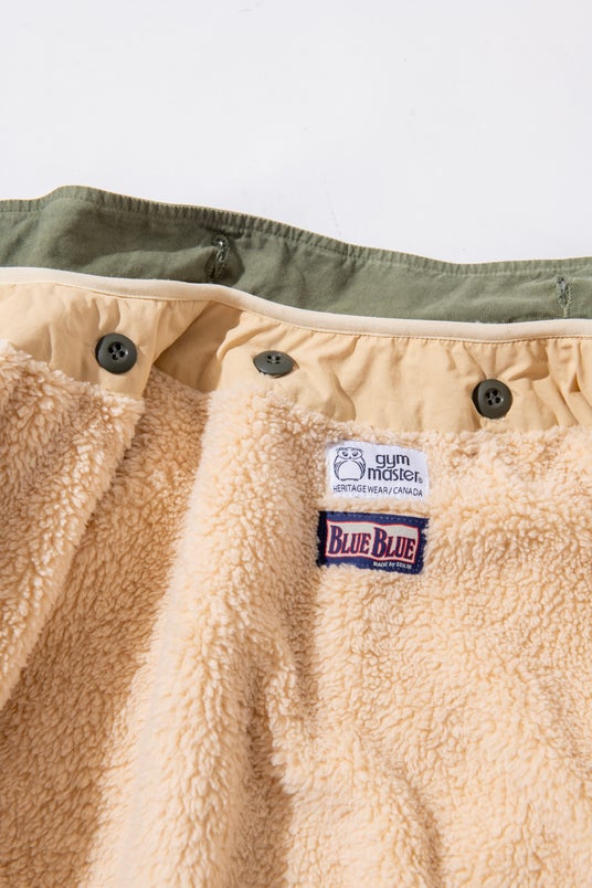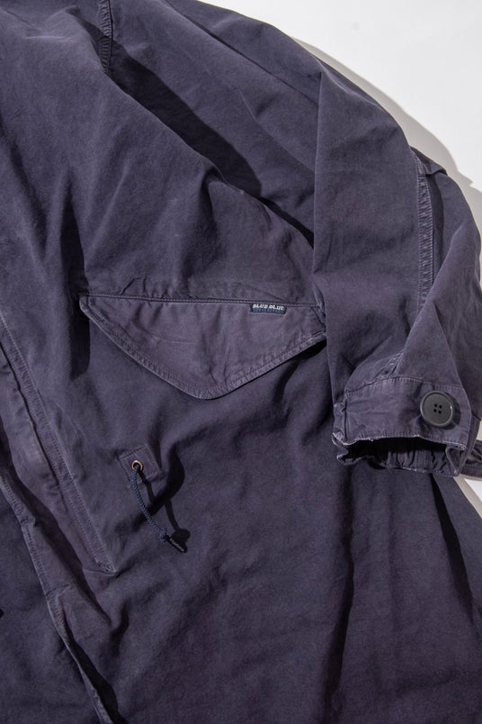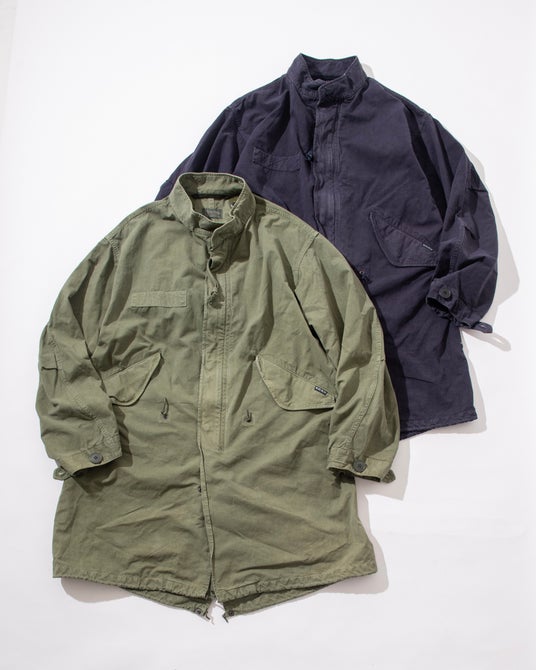1960年代の米軍のフィッシュテールコートをベースに、アームホールやポケット位置を現代的に調整し、ボリューム感を残しながら全体をすっきりと整えました。秋には軽快なアウターとして、冬本番には別売りの〈gym master × BLUE BLUE〉フリースライナージャケットを装着することで、防寒性を高めた重厚なアウターとしても活躍します。