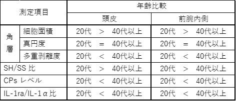 【表1:各測定項目とその年代別比較】