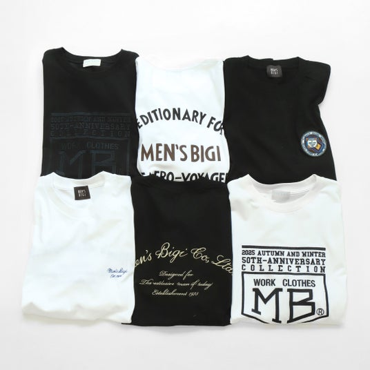 ブランド50周年を記念した、創業者・菊池武夫氏のアーカイブグラフィックを再解釈したTシャツに加え、メンズビギの50周年という節目を経て登場した特別なTシャツ2型がラインナップ。
