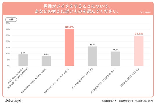 全国の20代~50代の女性2,000人を対象に、「男性がメイクすることに対しての考え」に関するアンケートを実施したところ、最も多かった回答は「特に気にならない(自由でいいと思う)」で30.2%となりました。