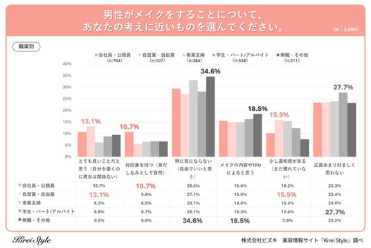 自身で事業を展開していく必要がある個人事業主では、トレンドへの感度が高かったり、ビジネスの活動の中で多様な人々と関わる機会が多かったりと、性別にとらわれない価値観が根付きやすく、男性のメイクに対しても肯定的な姿勢につながっている可能性が伺えました。