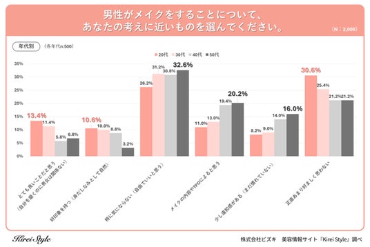 一方、「正直あまり好ましく思わない」方は20代で最も多くなりましたが、若年層ではメディアやSNSの影響もあり、「男性のメイク」が身近な存在になりつつあります。