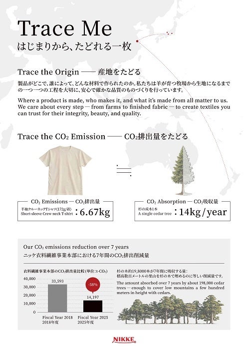 会場では、全ての工程履歴が追跡可能なTシャツを初公開します。牧場、原毛、糸、生地、染色整理、縫製から製品にいたるまでの履歴を追跡できるだけでなく、工程ごとのCO2排出量を把握することが可能なTシャツです。