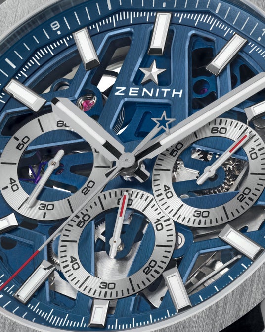 スケルトン加工技術とは、地板やブリッジなどムーブメントの部品を開放し、内部機構の動きを見えるようにするものです。この技術により、フロントとケースバックの両側から、サファイアガラスを通して革新的な「デファイ スカイライン クロノグラフ」のキャリバーを眺めることができます。垂直統合型のマニュファクチュールであるゼニスでは、デザイナー、エンジニア、時計職人が常に連携し、自由な創造を可能にしています。スケルトン加工への現代的で芸術的なゼニスのアプローチは、「デファイ スカイライン クロノグラフ」の優れた機能性と視認性を存分に活かし、同時に大胆な技術特性を際立たせています。時刻のみを表示する「デファイ スカイライン スケルトン」と同様に、文字盤には1960年代のゼニスの「ダブルZ」ロゴを彷彿とさせる幾何学的なカットアウトが施されています。また、コントラストが際立つアジュレ仕上げのグレーサブダイヤルにもオープンワークが施されています。さらに、植字によるファセットカットのバトン型アワーマーカーと針にはスーパールミノバを塗布し、あらゆる環境下での視認性を高めています。