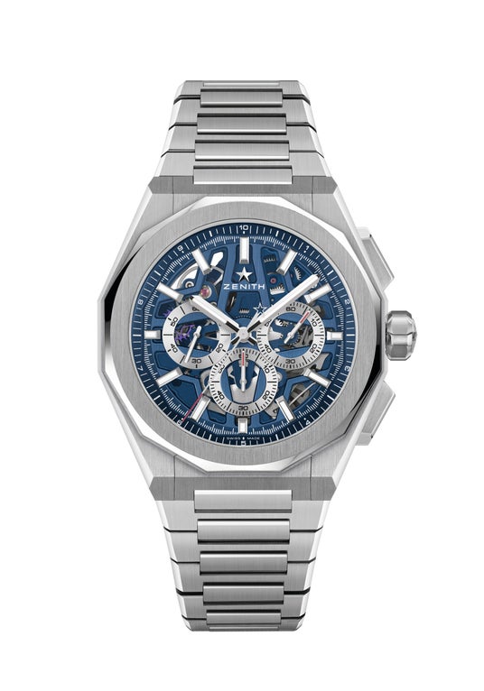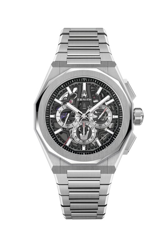 「デファイ スカイライン」の特徴である八角形の42mmケースはスチールを素材とし、12面のベゼルとダイナミックなプッシュボタンを備えています。ブラッシュ仕上げとポリッシュ仕上げを交互に施した表面に生まれる魅惑的な輝きと陰影が、その角張ったデザインを引き立てます。性能を重視したこのタイムピースは、シースルーの裏蓋を六角形のスクリュー4つとゼニススターのエングレービングを施したねじ込み式リューズで固定し、10気圧の防水機能を確保しています。