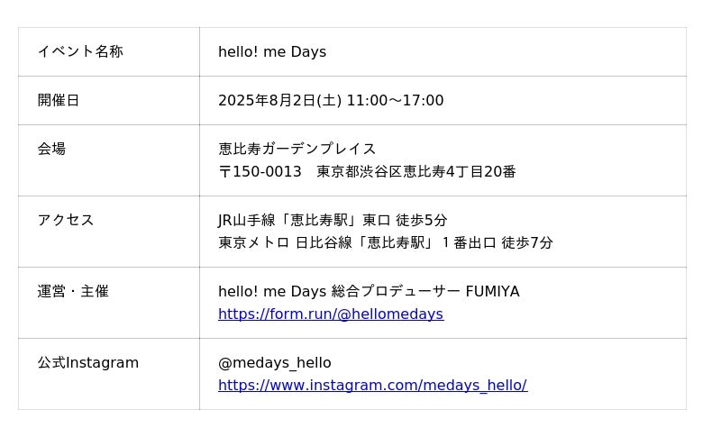 「hello! me Days」は、“女性の偉大さ”を祝福し、妊娠・出産・子育てをはじめとするライフステージの多様な選択を社会全体で支える意義を広く伝える1日限定の体験型イベントです。ライフスタイル・ビューティ・フード・ファミリー分野を横断する多彩な企業が参加し、訪れるすべての方にとって心躍るひとときを提供します。