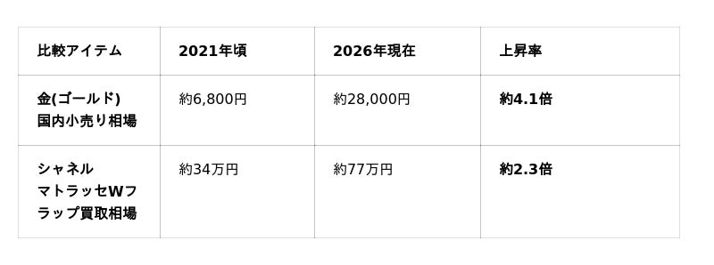 中古ブランド品の買取・販売を行う株式会社K-ブランドオフは、連日の金相場高騰報道の中で見落とされがちな「金(ゴールド)と並行して高騰するブランド品(特にシャネル)の資産価値」について、最新の相場推移に基づく比較・検証データを公開いたします。