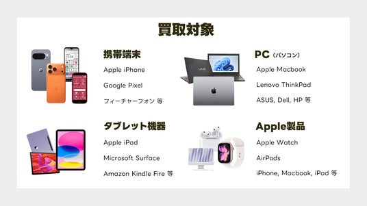 IVAはこうした市場動向を踏まえ、携帯端末・PC・タブレット機器・Apple製品を新たに買取カテゴリーに追加しました。