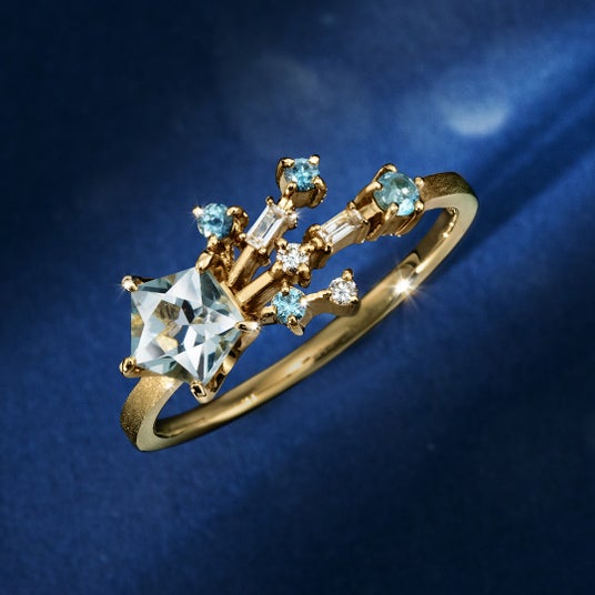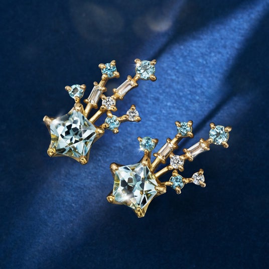 また、石ごとに爪の数を変えて留めることで繊細な光を引き出し、石座の裏側には星の透かし模様を忍ばせています。熟練の職人技により、細部まで精巧に仕上げられています。華やかでありながら知的なブルーの輝きが、特別なシーンにはもちろん、日常にも凛とした美しさを添えてくれるジュエリーです。