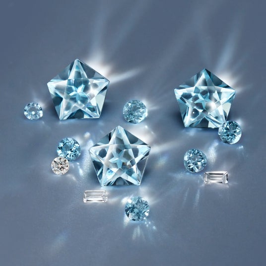 主体石には、五角形にカットされた「ペンタゴンカット」を採用。多面に光を反射することで、光が差し込む際に、星のような輝きが浮かび上がる特別なカットです。その軌道を描くように、ダイヤモンドなどの煌びやかな宝石を配置しました。シャープな直線の輝きを放つ「バケットカット」、きらめきにリズムを与える「ラウンドカット」といった異なる形のカットを組み合わせることで、流れ星の瞬きを立体的に表現しています。