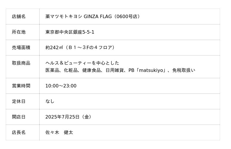 また、店舗に訪れるお客様には、グループスローガンである「Find your "!" wow」にこめた「次はどんなことに出会えるだろう!」と驚きやワクワクした気分になっていただきたいという想いで店舗展開を進めております。このたび、1999年にオープンし「銀座にあのマツキヨが!」と注目を集めた銀座5th店を全面改装し、マツキヨココカラのフラッグシップストア「GINZA FLAG」としてオープンいたします。
