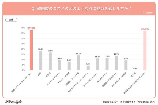 20歳~59歳の女性2,000人に「韓国製のコスメのどのような点に魅力を感じますか?(複数回答可)」と尋ねたところ、最も多かった回答は「価格(コストパフォーマンス)」で37.9%となりました。