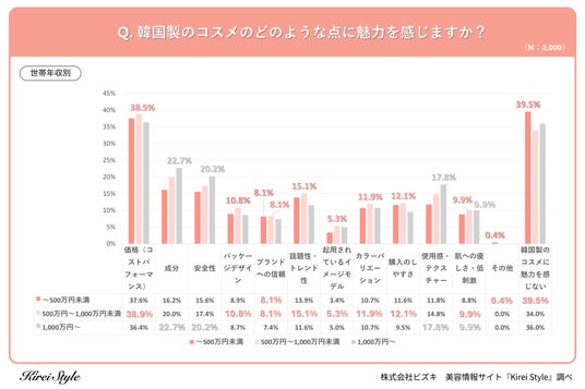 世帯年収別に見たところ、「韓国製のコスメに魅力を感じない」と回答した割合は、「~500万円未満」の層が39.5%であるのに対し、「500万円~1,000万円未満」の層では34.0%、「1,000万円~」の層では36.0%と、高年収層の方が低い(=何らかの魅力を感じている)結果となりました。