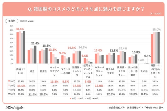 なお、「価格(コストパフォーマンス)」については、全年代を通して36%~39%台と高い水準を維持しており、年代問わず韓国コスメの最大の魅力となっていることが分かりました。