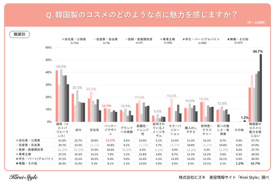 一方で、「専業主婦」の38.9%、「学生・パート/アルバイト」の40.9%、無職・その他に関しては54.7%の方が「韓国製のコスメに魅力を感じない」と回答。韓国コスメが大ブームとなっている昨今ですが、その魅力を感じない層の割合も比較的高いことが分かりました。