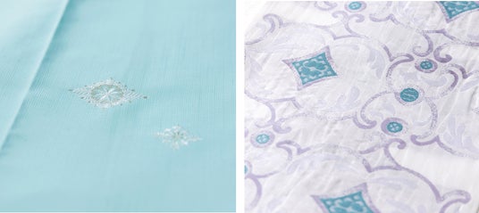玉繭の意匠が印象的な帯と、華紋の刺繍がエレガントな結城紬の組み合わせ。強撚糸を使った帯はシャリ感やシボがあり、結びやすさも抜群です。結城紬のきものは艶のある刺繍柄が浮き出るようにマットに仕上げ、大人の女性にふさわしい上品な装いが楽しめます。