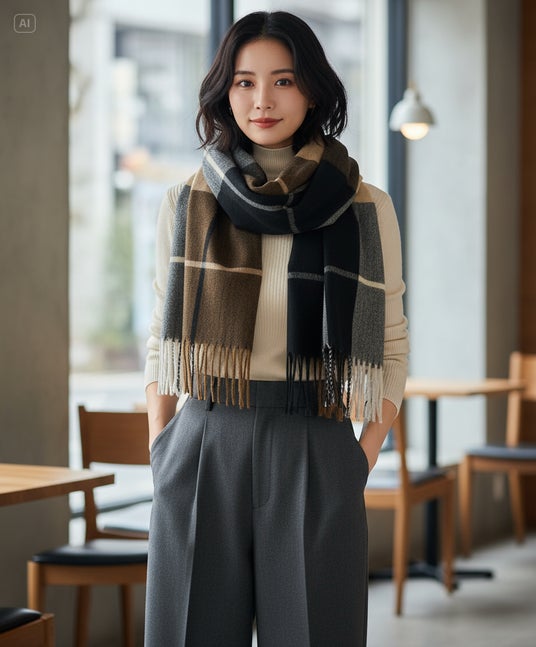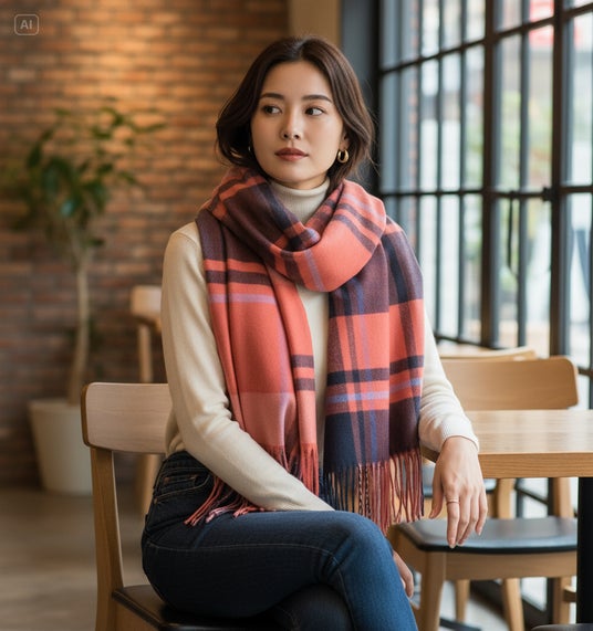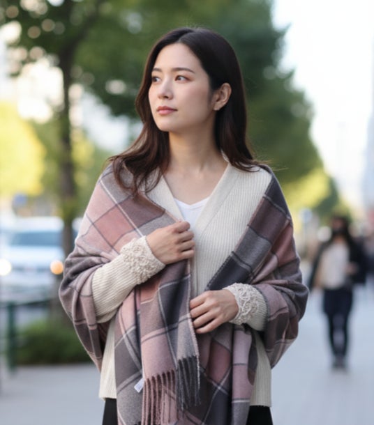 まるでカシミヤのようなふんわりとした肌触りと、上品なチェック柄が特徴。