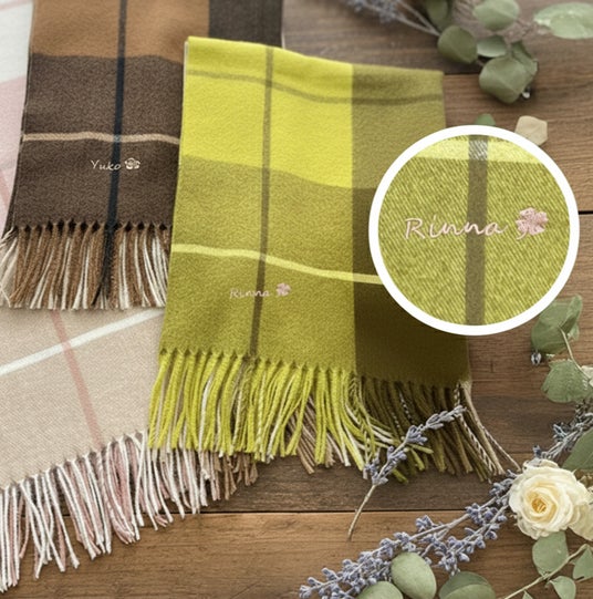 「Okulu」限定の刺繍サービスでは、ストールのカラーに合わせた糸色で名入れを施します。