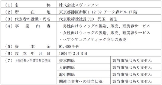 当社は、本日開催の取締役会において、ウィッグをはじめ、ヘアケア製品や関連サービスを提供する株式会社スヴェンソン(本社:東京都港区、代表取締役社長CEO 児玉義則、以下「スヴェンソン社」)レディス事業部との間で、両社の企業価値向上を目指すことを目的として業務提携基本契約を締結しましたので、下記のとおりお知らせいたします。